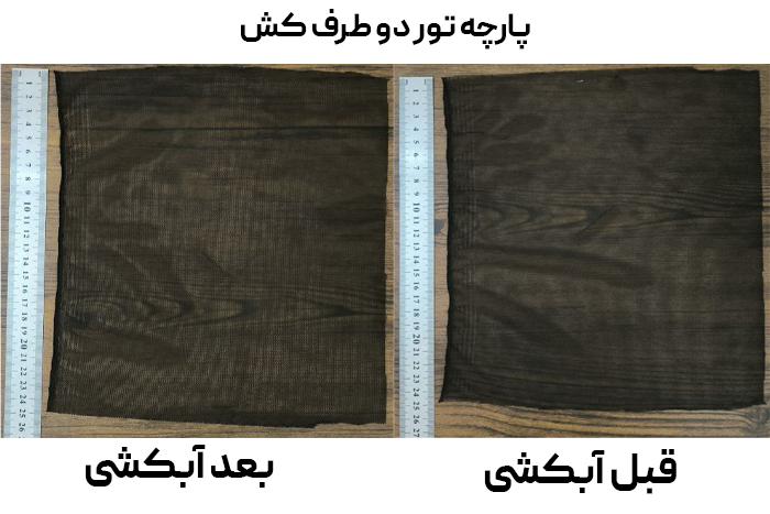 پارچه تور دو طرف کش بعد از تست آبرفت هیچ آبرفتی در طول و عرض نداشته است.