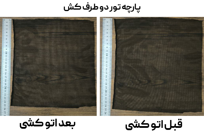 پارچه تور دو طرف کش از جهت طول 10 سانتی متر کشسانی دارد. این پارچه در جهت عرض 15 سانتی متر کشسانی دارد.